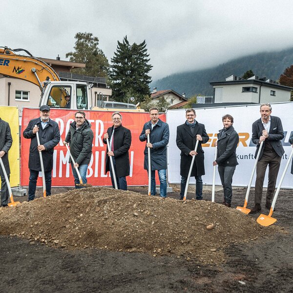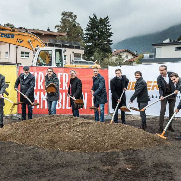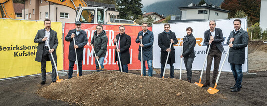 Beim Spatenstich mit dabei waren u.a.: Markus Guggenberger (Raiffeisen Bezirksbank Kufstein), Stefan Kaiserer (GF Tiroler Immobilien), DI Anton Rieder (Riederbau), Kufsteins Bürgermeister Martin Krumschnabel, Alfred Thaler (GF Tiroler Immobilien), Architekt Christoph Moriggl (ao-Architekten ZT-GmbH), Marc Osl (Riederbau), Philipp Weber (RLB Tirol AG), Mario Tribus (Vertriebsleiter Tiroler Immobilien).
