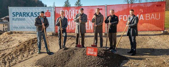 Den Spatenstich im Rahmen der kleinen Feier nahmen mit den Geschäftsführern von Tiroler Immobilien Alfred Thaler und Stefan Kaiserer vor: Der Langkampfener Bürgermeister Andreas Ehrenstrasser, GF Josef Hauser (Formabau GmbH), Prokurist Michael Koller (Leiter Kommerzcenter Wörgl, Sparkasse Kufstein) und Mario Tribus (Vertriebsleiter Tiroler Immobilien).