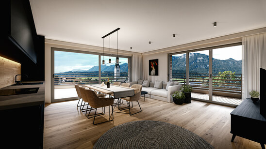 Besondere Highlights des Projekts sind die Dachgeschosswohnungen mit atemberaubendem Panoramablick auf die umliegende Bergkulisse.