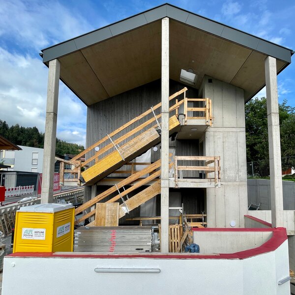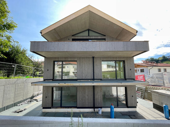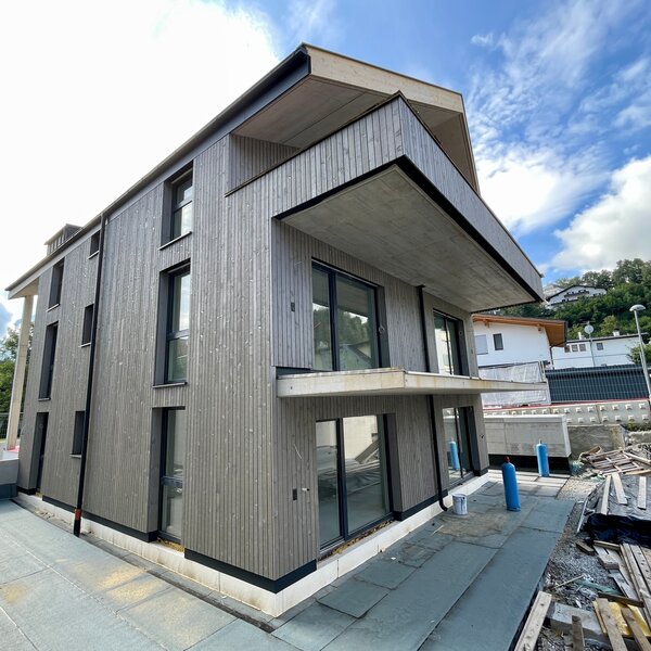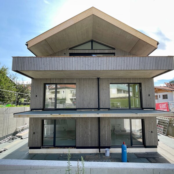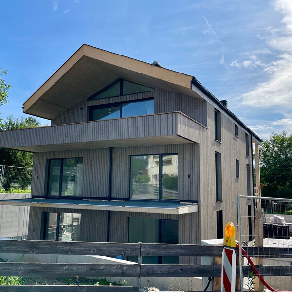 Die Arbeiten am Hinteranger schreiten planmäßig voran. Die Holzfassade, die dem Gebäude seinen charakteristischen und naturnahen Look verleiht, wurde kürzlich fertiggestellt. Dieses Detail unterstreicht den Anspruch, modernes Wohnen mit einem hohen ästhetischen und ökologischen Wert zu vereinen.