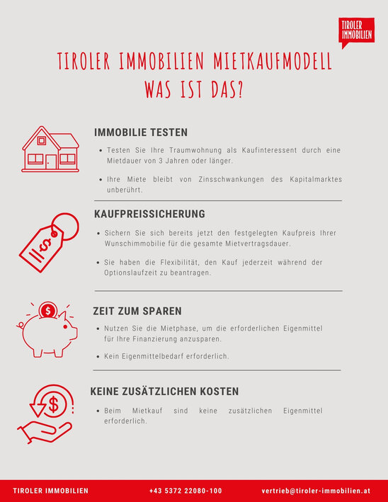 Träumen Sie von den eigenen vier Wänden, möchten aber vor dem endgültigen Kauf Ihre Traumimmobilie testen? Das Tiroler Immobilien Mietkauf-Modell bietet die ideale Lösung!