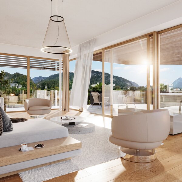 Am Kaiseraufstieg 27 in Ebbs, in ruhiger Grünlage direkt am idyllischen Kaiserbach, vereint das Penthouse Privatsphäre, Natur und modernste Architektur. Der lichtdurchflutete Grundriss und die großzügige Raumhöhe von 2,60 m schaffen eine Atmosphäre von Eleganz und Weite. Mit einem privaten Aufzug, der direkten Verbindung zur Tiefgarage und optionalen Highlights wie Whirlpools, Sauna, Kamin und Smart-Home-Technologie bietet dieses Zuhause höchsten Komfort.